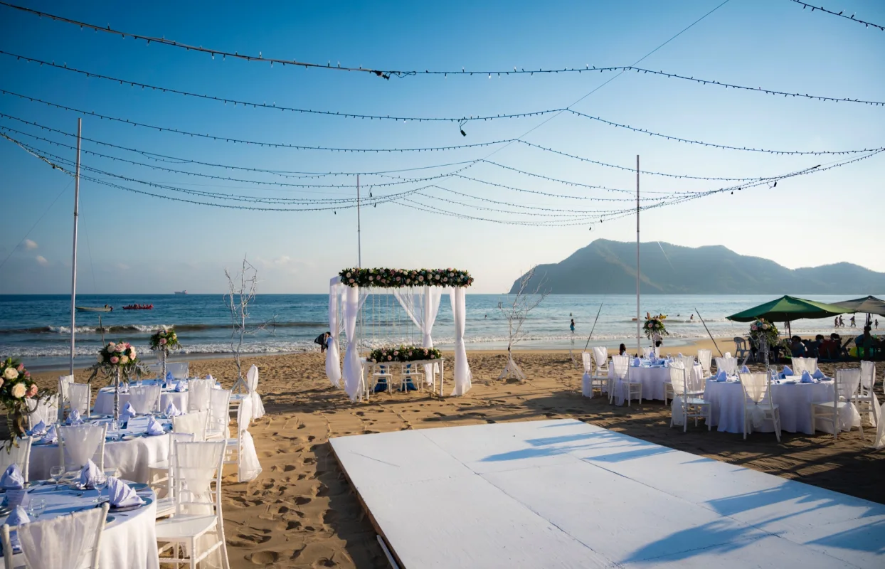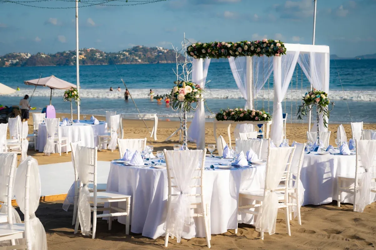 - Banquete en la playa, jardín o alberca solárium con mesa redonda y mantelería blanca.